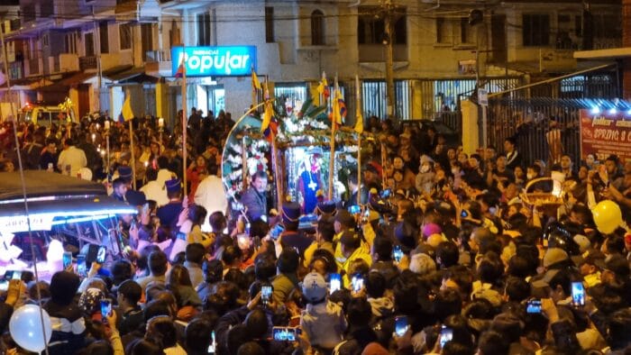 A lo largo de la céntrica calle Bolívar eran decenas de personas y familias enteras que esperaban su paso para unirse a la procesión. Aguardaban con velas, candelabros, carteles, globos, poster de la imagen religiosa y pétalos de rosas.