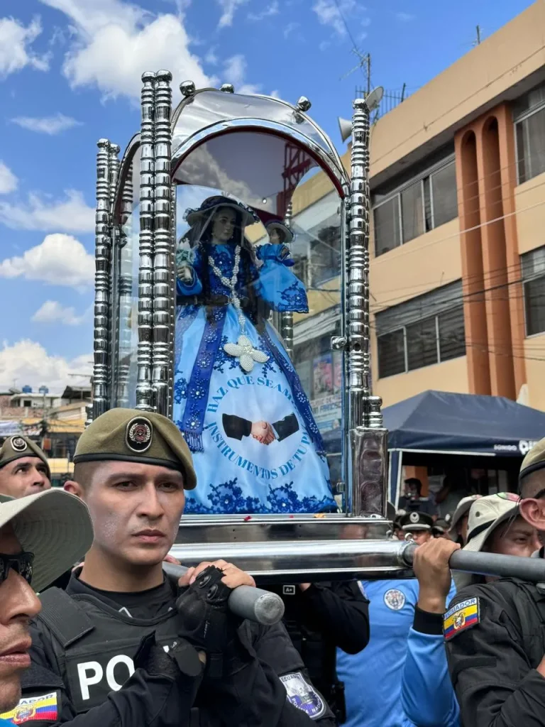En una reunión con la Policía Nacional, la Prefectura de Loja, el ECU 911, el Gobierno Municipal y otras entidades, el Obispo Heras enfatizó la importancia de coordinar esfuerzos para que la procesión se desarrolle en paz y tranquilidad. “Necesitamos de todos los contingentes para el traslado de la Santa Imagen, especialmente en la seguridad de la Virgen y de quienes caminarán junto a ella”, expresó Heras. La Policía Nacional destinará 150 efectivos para formar un cerco interno y externo durante el recorrido, en el que también se emplearán patrulleros y motocicletas para brindar un acompañamiento constante y vigilar a los feligreses.