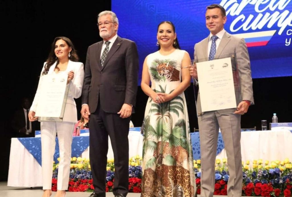 A un mes de la segunda vuelta de las elecciones anticipadas 2023, el binomio presidencial Daniel Noboa-Verónica Abad recibió sus credenciales por parte del Consejo Nacional Electoral (CNE). El acto se realizó este 15 de noviembre del 2023 en el Teatro Sucre, centro de Quito.