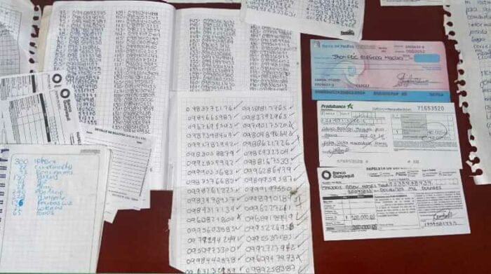 Además, los agentes policiales encontraron como evidencias listas de números telefónicos, cheques y papeletas de retiros.