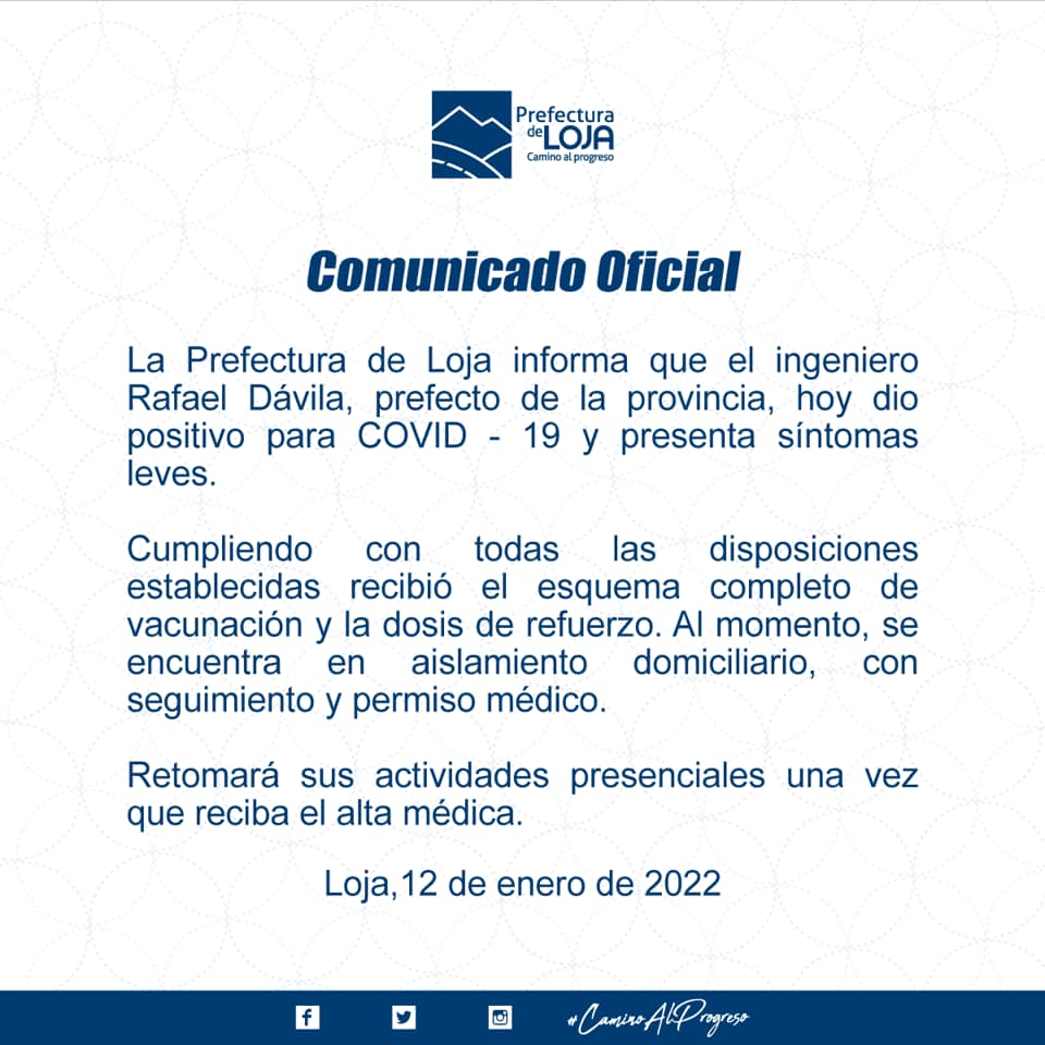 Así lo informa un comunicado oficial de la Prefectura de Loja en sus redes sociales, añade que la autoridad “presenta síntomas leves”.El funcionario provincial, según se informa, cumpliendo con todas las disposiciones establecidas, recibió el esquema completo de vacunación y las dosis de refuerzo.