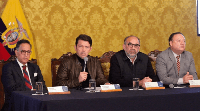 El ministro de Gobierno, Francisco Jiménez; el secretario de la Administración Pública, Iván Correa; el ministro del Interior, Juan Zapata; y el secretario de Seguridad, Diego Ordóñez, se reunieron esta tarde en el Salón Amarillo del Palacio de Carondelet para explicar las acciones del Gobierno respecto al caso de presunta corrupción en empresas públicas.