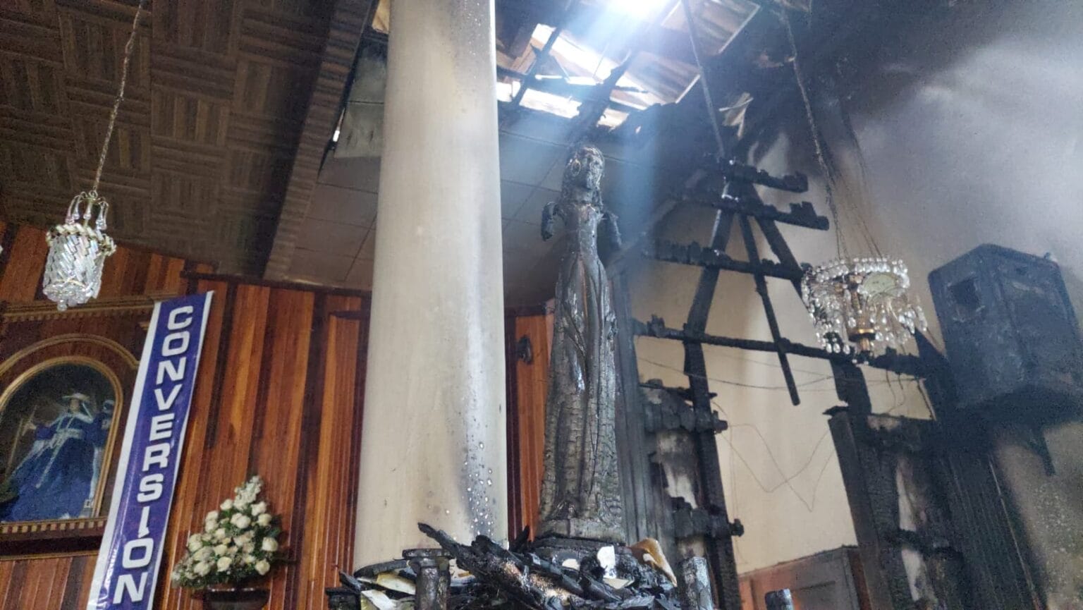 William Polo, encargado del Templo, manifestó que el incendio en la parte interna de la iglesia se registró la madrugada del último domingo, al parecer producto de un cortocircuito, dejando varios daños como: imágenes calcinadas, pesebre destruido, urnas arruinadas, retablo y tumbado calcinado.