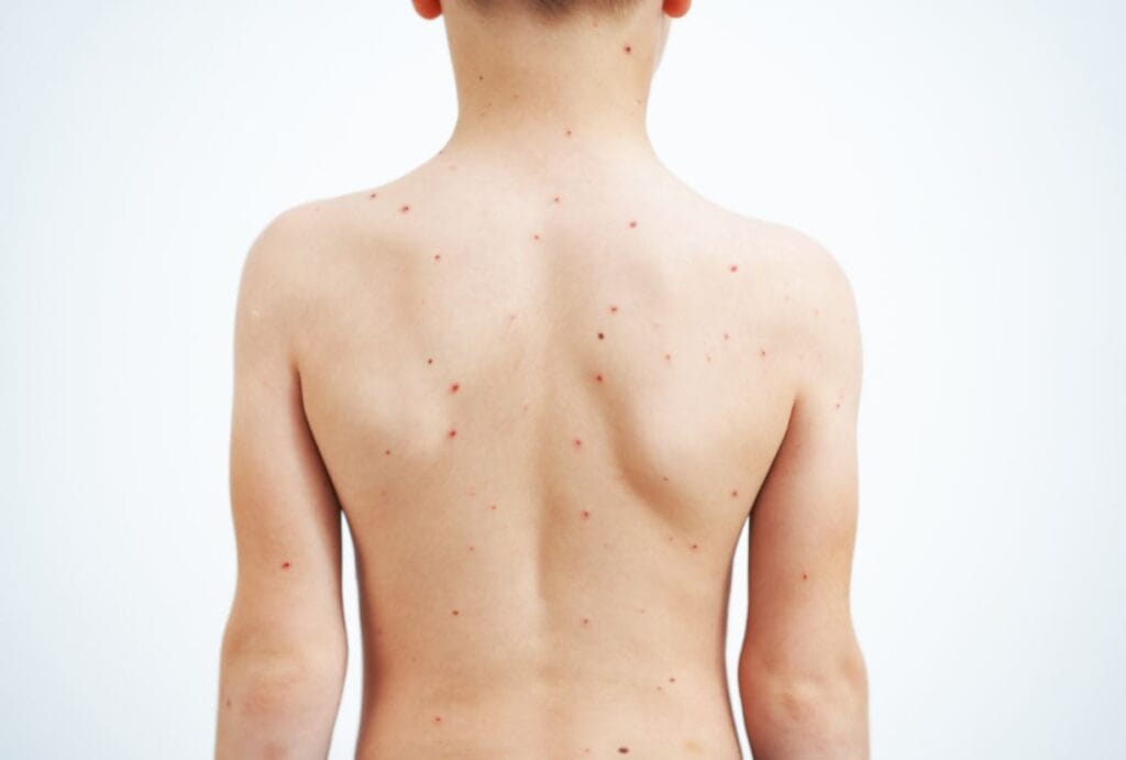 Los síntomas incluyen fiebre, dolor de cabeza intenso, dolores musculares, dolor de espalda, poca energía, ganglios linfáticos inflamados y erupciones o lesiones en la piel. La erupción comienza en el primer o tercer día del comienzo de la fiebre. Las lesiones pueden ser planas o ligeramente elevadas, llenas de líquido transparente o amarillento, para después formar costras, secarse y caerse.